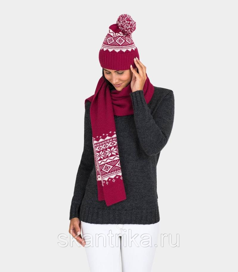 Комплект из 3-х вещей - шапка, шарф и митенки в ярком карминовом цвете. Приобретите комплект и получите скидку.